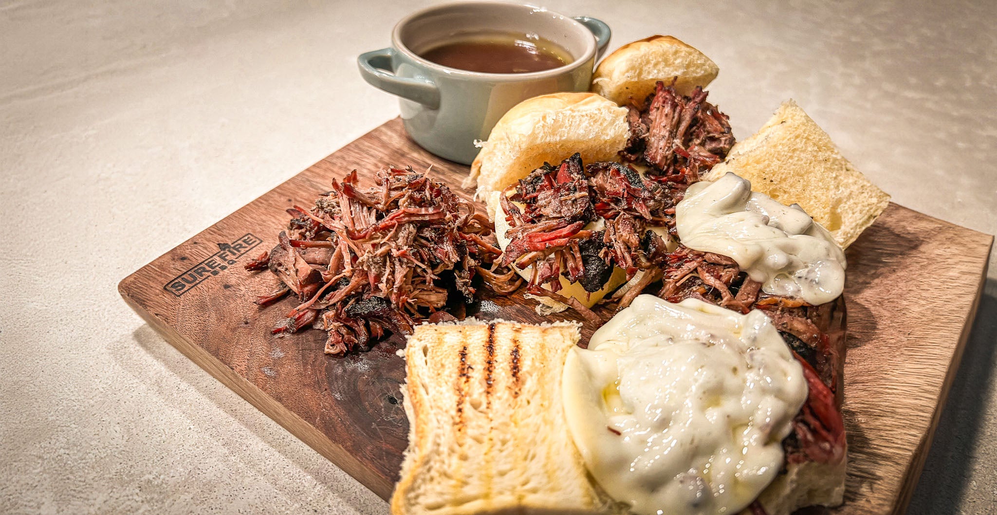 Try this smoked chuck roast seasoned with Beef Rub and braised in stock & butter until pull apart tender. Served with provolone and au jus.