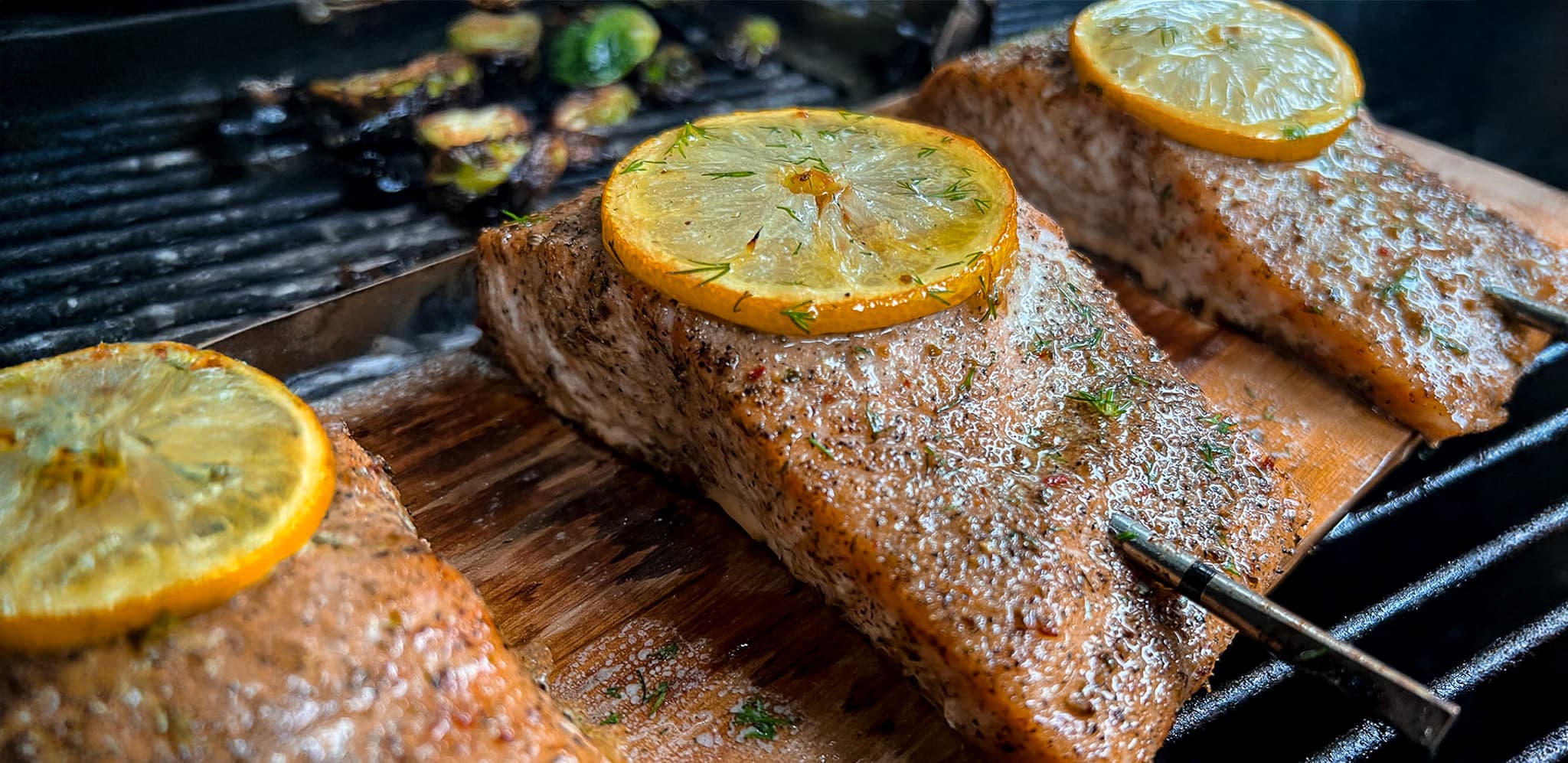 These salmon filets are seasoned with Lemon Pepper and finished in a lemon butter dill sauce. Grill them on cedar planks over an offset charcoal grill for maximum flavor and texture.